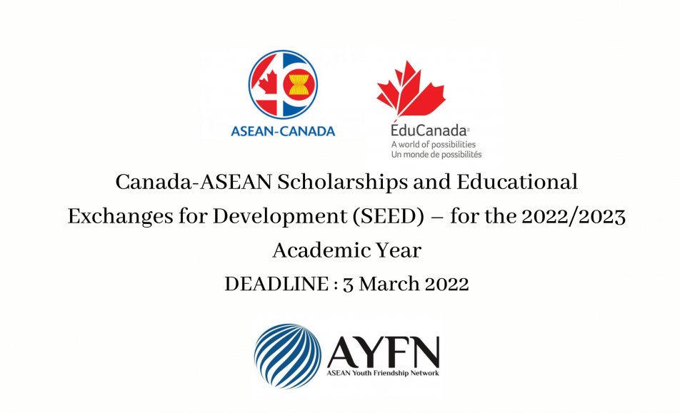Competition: Open for the 2022-2023 academic year Deadline: March 3, 2022 Who applies: Canadian post-secondary institutions The Canada-ASEAN Scholarships and Educational Exchanges for Development (SEED) program provides students, from member states of the Association of Southeast Asian Nations (ASEAN), with short-term exchange opportunities...