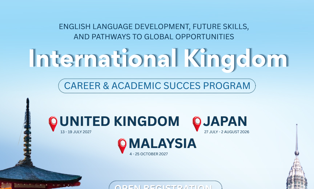 Upon completion, all 120 selected participants of the program will be eligible for a scholarship from International Kingdom to participate in an overseas program. Participants may select their destination based on suitability, including the United Kingdom, Japan, or Malaysia. *Please note that scholarship, including program duration and flight arrangements, may vary depending on the selected destination and program structure.